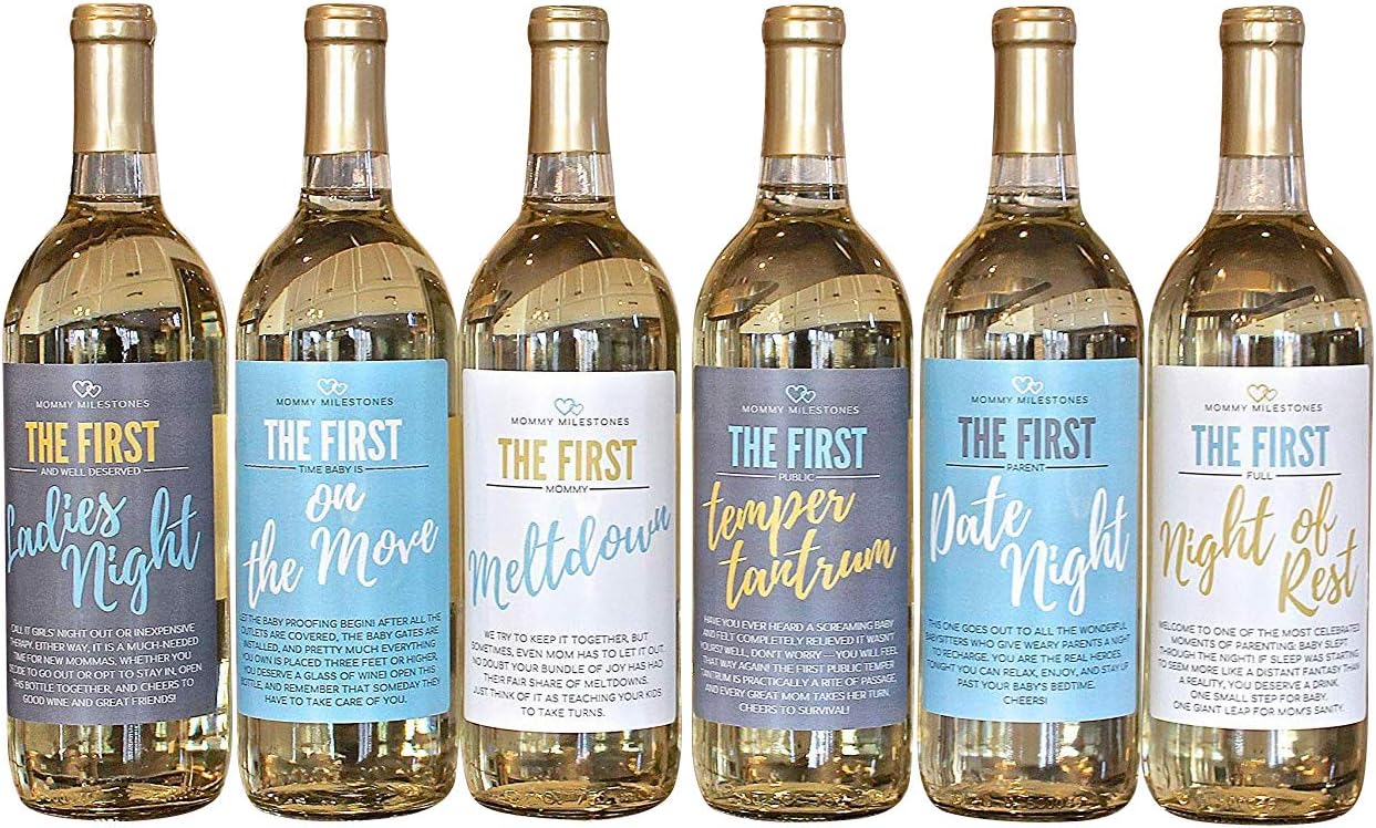 Amazon.com: 6 Mommy's First Milestone Stickers or Wine Labels, for Mom ... 6 Mommy's First Milestone Wine Labels and Stickers, Great Baby Shower and Pregnancy Gift Ideas for Mom To Be, Funny Mom's First Moments After Having New Baby Girl or Boy - By Harper & Ivy Designs $12.95 Big Dot of Happiness Daddy's First Milestones - Decorations for Men - 6 Beer Bottle Label Stickers and 1 Carrier $11.99 new baby wine
